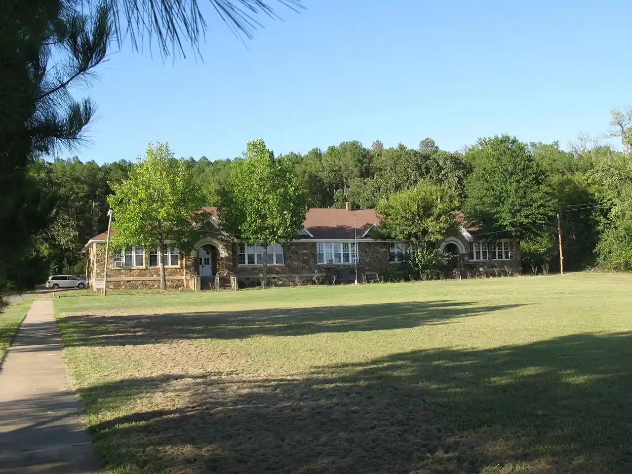 The Parks School is a historic former school building just north of Arkansas Highway 28 in the center of Parks, Arkansas. It is a single-story fieldstone structure, with a gable-on-hip roof, and several small gabled dormers on the long (south-facing) front facade. Two entrances are set in round-arch openings with keystones. The building has retained most of its original windows, doors, and other original hardware. It was built in 1940 with funding from the Works Progress Administration, and served as a school into the 1960s. It is now a local senior center. Read more on Wikipedia