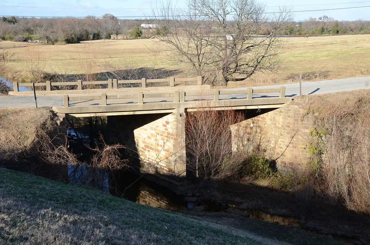 The Coop Creek Bridge is a historic bridge in Sebastian County, Arkansas, just outside the city of Mansfield. It carries Broadway, designated County Route 62, across Coop Creek just north of Mansfield Lake. It is a two-span open masonry structure, with one span of and one of , with a total structure length of . The bridge is set on masonry abutments and piers, with a reinforced concrete deck that is lined by simple concrete railings. It is a well-preserved example of a masonry bridge built in 1940. Read more on Wikipedia