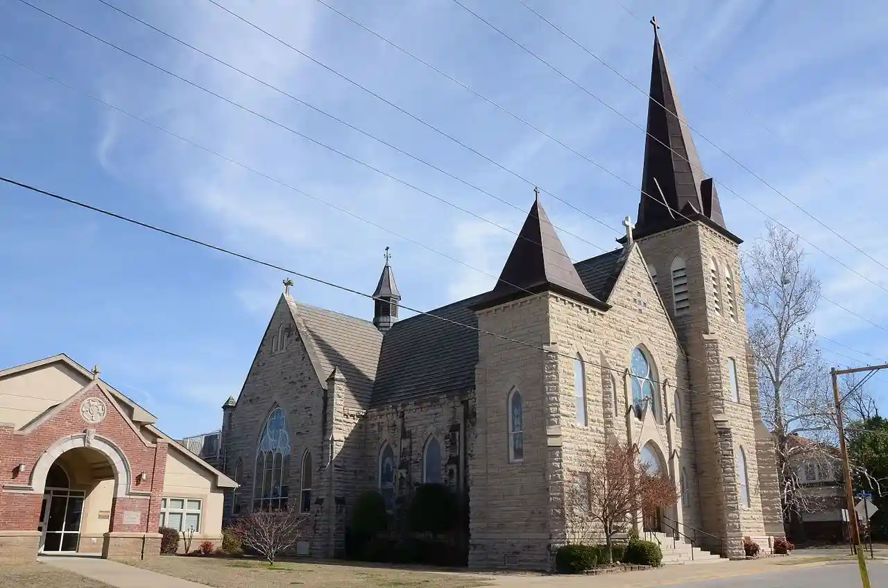 The First Evangelical Lutheran Church is a historic church building at 1115 North D Street in Fort Smith, Arkansas. It is a large limestone structure, built in a cruciform plan with a pair of towers flanking its main facade. It was built in 1901–04 to a design by William Hornor Blakely, a prominent local architect. The congregation for which it was built was formally established in 1852 by German immigrants to the area. Its first church, completed in 1869, stood nearby, and was converted to educational use by the congregation. Read more on Wikipedia