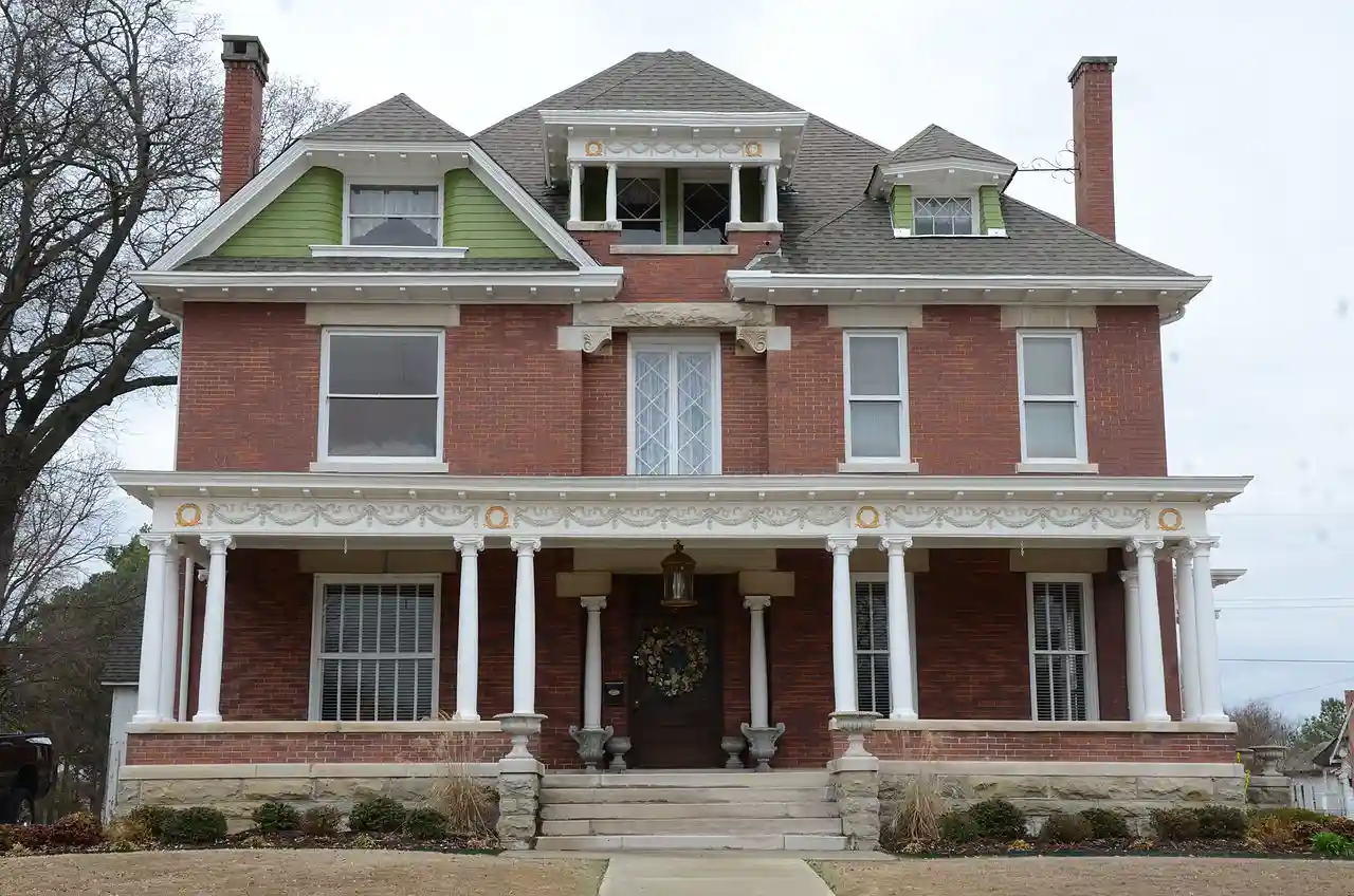 The William J. Murphy House is a historic house at 923 North 13th Street in Fort Smith, Arkansas, United States. It is a rectangular -story brick structure, with basically symmetrical massing by asymmetric details. The main roofline is hipped toward the front facade, with a pair of similarly sized projections on either side of a central raised hip-roof porch at the third level. The left projection has larger single windows at the first and second levels, and a small window recessed within a jerkin-headed gable pediment. The right projection has two narrower windows on the first and second levels and a small hipped element projecting from the top of that section's hip roof. A single-story porch extends across the width, supported by paired columns, with an entablature decorated by garlands. The house, built about 1895, is one of Fort Smith's most sophisticated expressions of Classical Revival architecture. It was built by a local manufacturer of saddles and harnesses. Read more on Wikipedia
