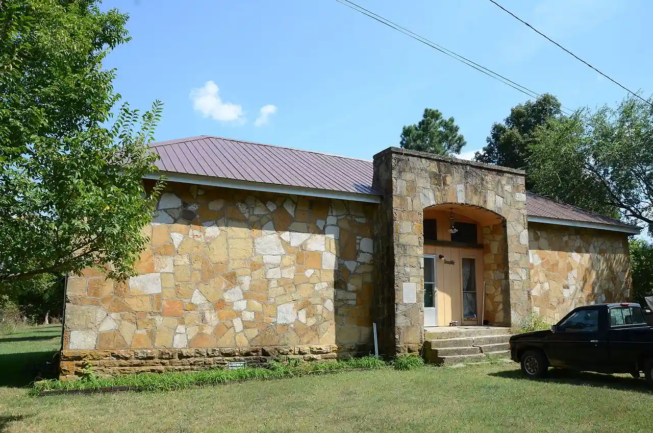 The Alco School is a former educational facility located just north of Arkansas Highway 66 in rural western Stone County, Arkansas, not far from the hamlet of Alco. It is a single-story stone structure, with a hip roof that has two eyebrow dormers. The main entry is on the western facade, sheltered by a parapeted porch. The interior originally had two classrooms, and has been converted to residential use. The school was built in 1938 as a National Youth Administration works project. Read more on Wikipedia