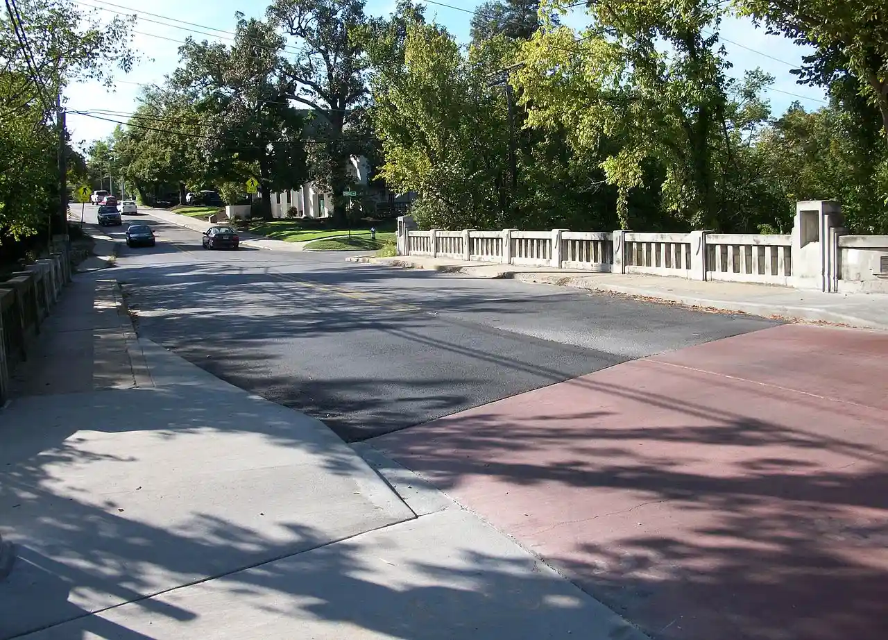 The Maple Street Overpass is a historic bridge in Fayetteville, Arkansas. The bridge carries West Maple Street over the railroad tracks running just east of the University of Arkansas at Fayetteville campus. It is a reinforced concrete single-span arch, in length and in width. The bridge has a decorative Art Deco balustrade with inset lights on both sides. The bridge was designed by regional bridge designer Frederick Lutt Johann, and built in 1936. Read more on Wikipedia