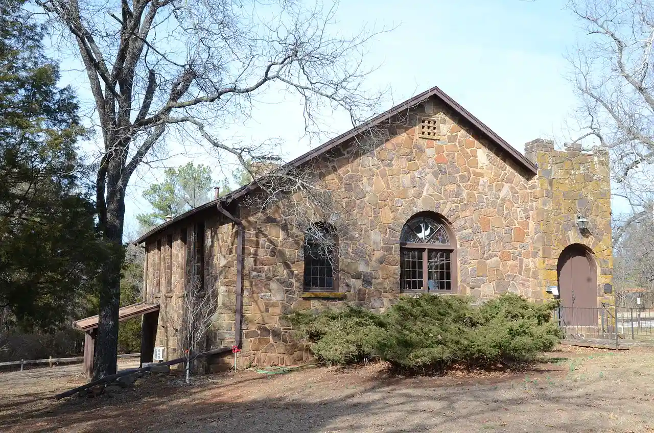 Son's Chapel is a historic church at 5480 East Mission in Fayetteville, Arkansas. It is a single-story rustic fieldstone structure, with front-gable roof and a squat square tower set off to one side. Built between 1933 and 1937, the building is an interesting and unusual mix of Gothic and Romanesque styles, with windows set under Romanesque arches, and the tower with a crenellated parapet. The church is the second for the congregation, which was established c. 1848 on land donated by Michael Son. Read more on Wikipedia