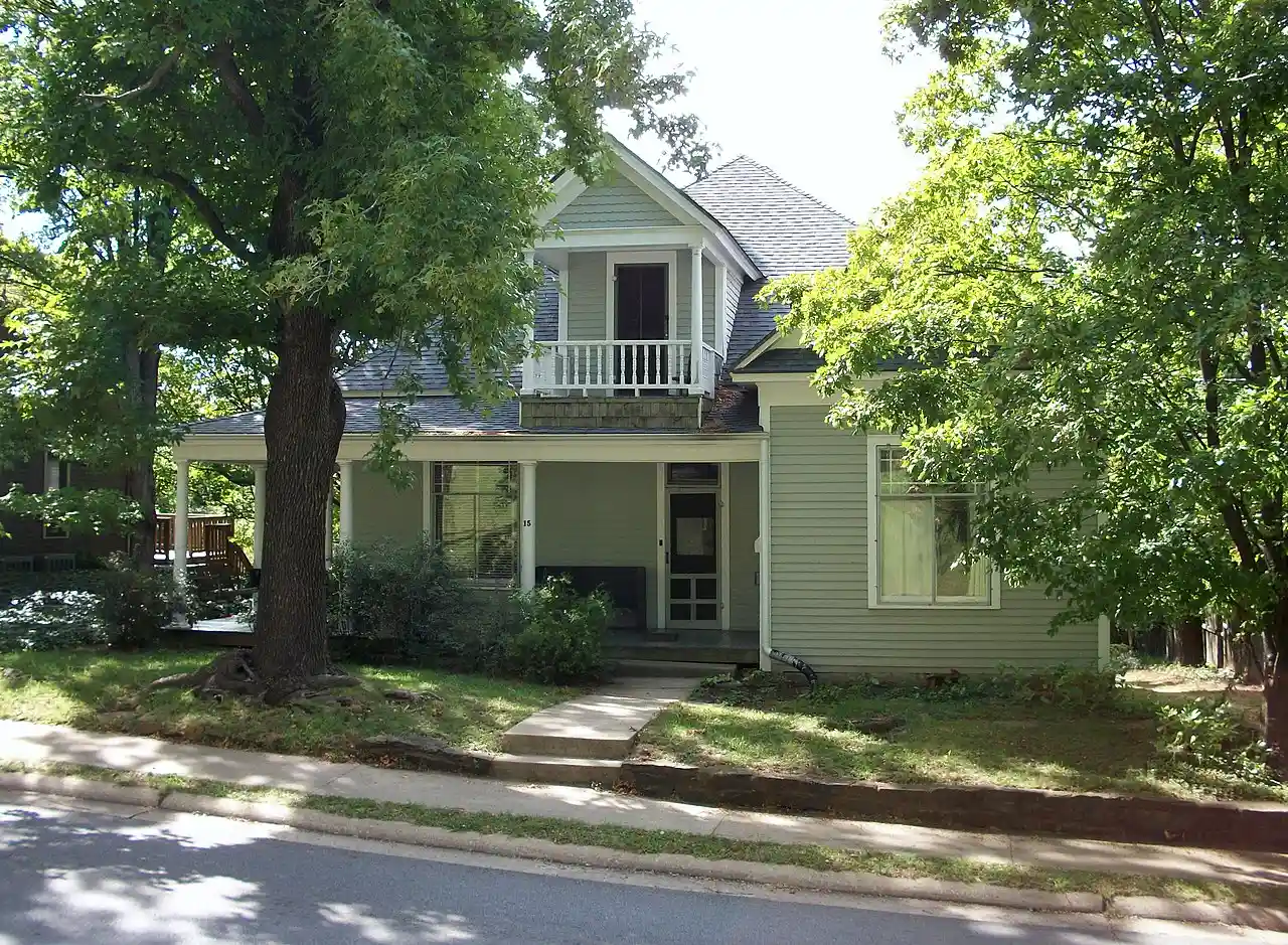 The Tharp House is a historic house at 15 North West Avenue in Fayetteville, Arkansas. It is a -story wood-frame house, with Queen Anne styling. Its front facade is three bays wide, with a projecting square gable-roofed section to the right, and the main entrance in the center, sheltered by a porch that wraps around the left side. A large gabled dormer projects from the hip roof above the entrance, large enough for a doorway and a small balcony. Built in 1904 by Moses Tharp, it is an unusual local example of late Queen Anne style. Read more on Wikipedia