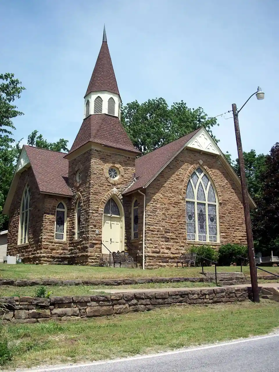 The United Presbyterian Church of Canehill is a historic church on Main Street in Canehill, Arkansas. Built in 1891, it is the only surviving church building in the small community. It is a brick structure with a cruciform plan with steeply-pitched gable roofs, large Gothic-arched stained glass windows, and a tower with an octagonal belfry topped by a shingled steeple. Canehill was originally settled in 1828 by a Presbyterian group, and eventually supported three separate Presbyterian congregations over the course of the 19th century. These congregations were reunited into this building in 1905. Read more on Wikipedia