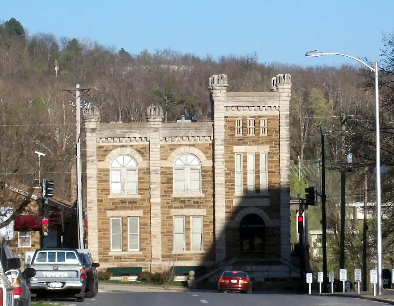 The Washington County Jail is a historic former civic building at 90 South College Avenue in Fayetteville, Arkansas. Built in 1896, this building was the fourth to serve as county jail, and was in use until 1973, making it the longest tenured in county history. The Romanesque Revival building was designed by W. B. Reese, and is locally unusual and distinctive for its medieval appearance. It is built out of load-bearing stone, square cut and laid in irregular courses, with a rough quarry-cut finish. Most of the building is of darker shades with trim in lighter shades. Nominally two stories in height, the rightmost bay has a square tower with crenellated parapet. Read more on Wikipedia