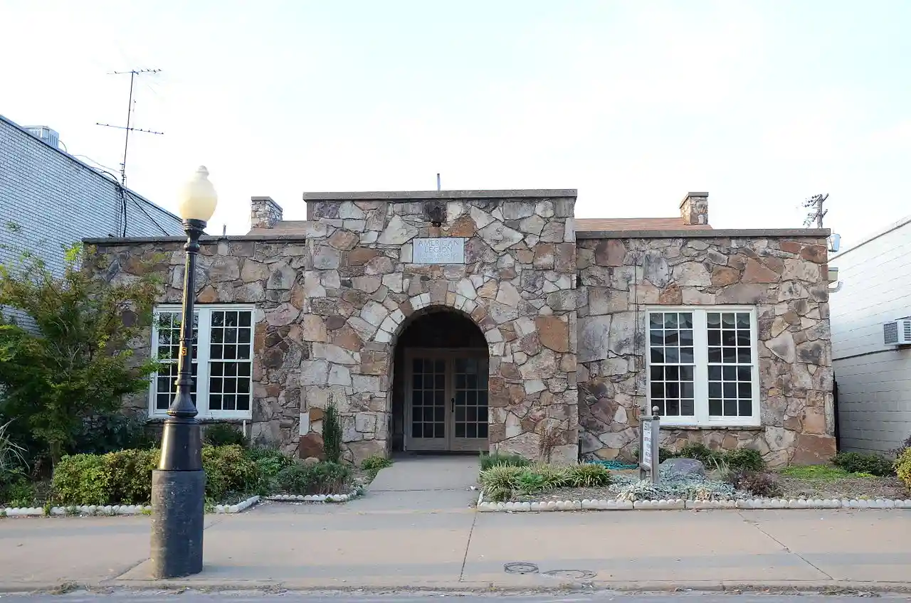 The American Legion Hall is a historic social meeting hall at Race and Spruce Streets in the center of Searcy, Arkansas. It is a single-story structure, built out of native fieldstone in 1939 with funding support from the Works Progress Administration (WPA). Its main block has a side-facing gable roof, with a projecting flat-roof section in which the entrance is recessed under a rounded archway. The building is typical of rustic-styled buildings constructed by the WPA and other jobs programs of the Great Depression. Read more on Wikipedia