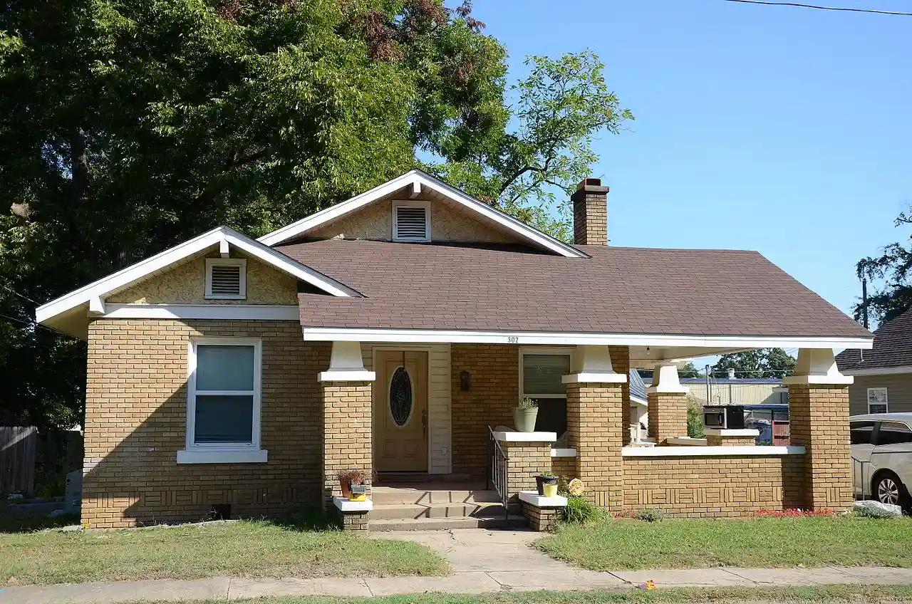 The Bell House is a historic house at 302 West Woodruff Avenue in Searcy, Arkansas. It is a single-story brick structure, with an irregular roofline. A porch, headed by a side gable entrance projects to the right, continuing across the front to meet a small front-gable projecting in front of a higher front-facing gable roof. The porch is supported by high brick piers topped by short wooden posts. Built in 1915, it is a fine local example of Craftsman architecture. Read more on Wikipedia