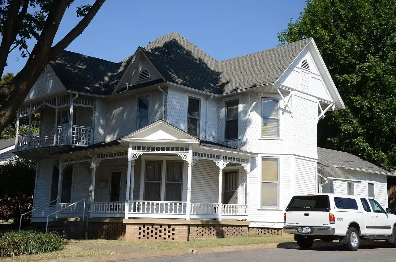 The Lattimer House is a historic house at Oak and Market Streets in Searcy, Arkansas. It is a two-story wood-frame structure, with a hip roof, and a variety of projecting gables and porches typical of the Queen Anne style. The upper level is clad in diamond-cut wooden shingles. A wraparound porch on the ground floor has delicately turned posts and balusters, while a projecting second-story porch has a heavier Stick-style balustrade and cornice. The house was built about 1895, and is one of Searcy's finest examples of the Queen Anne style. Read more on Wikipedia