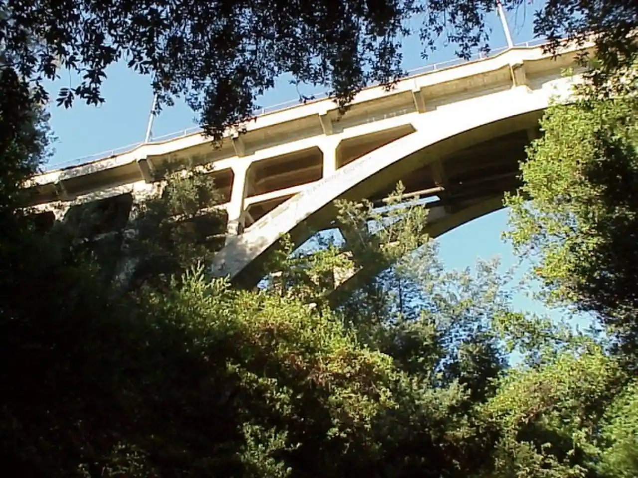 Leimert Bridge is located in the Oakmore neighborhood of Oakland, California. It spans and is high above Sausal Creek. It is a cement and steel arch bridge. When it was built in 1926, it was the largest single-span bridge on the West Coast. The Bixby Creek Bridge with a span of on the California Big Sur coast opened four years later in 1932. Read more on Wikipedia
