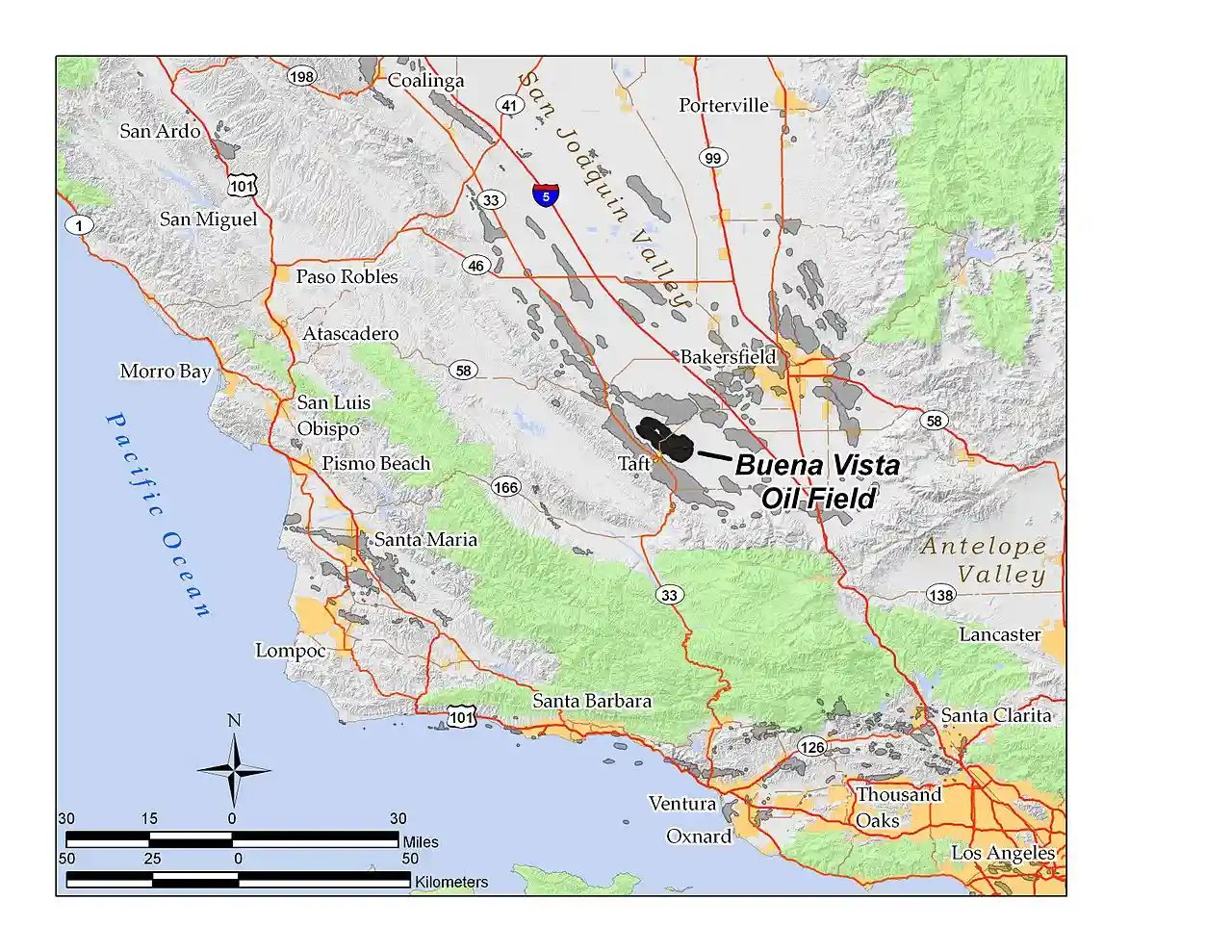 The Buena Vista Oil Field, formerly the Naval Petroleum Reserve No. 2 (NPR-2) is a large oil field in Kern County, San Joaquin Valley, California in the United States. Discovered in 1909, and having a cumulative production of approximately , it is the tenth-largest oil field in California. As of year end 2006 the field had a total reserve of only about one percent of its original oil, and having produced a mere .California Department of Conservation, Oil and Gas Statistics, Annual Report, December 31, 2006, p. 2 Since, the field has gone through a revitalization. Crimson Resources initiated a waterflood in the Etchegoin Formation, saw good response and sold the asset to Occidental Petroleum (now California Resources Corporation, CRC). CRC continued the development of the waterflood, but also tested the viability of the Monterey Formation. The Monterey Formation at Buena Vista has proven to be a viable target and is currently being developed. Read more on Wikipedia