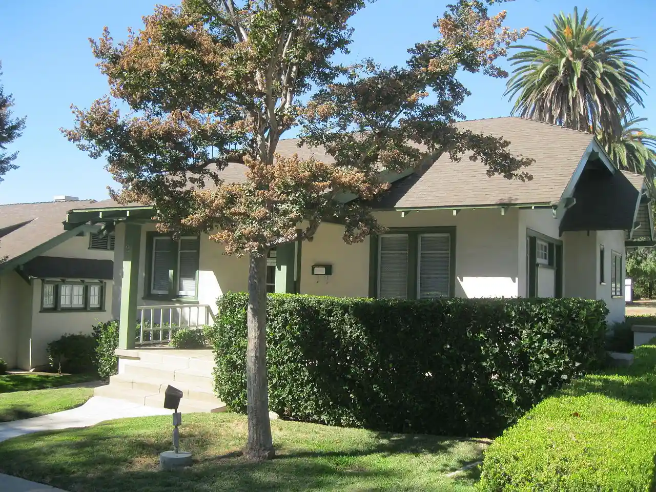 Bryan Court is a bungalow court located at 427 S. Marengo Ave. in Pasadena, California. The court includes seven Craftsman-style homes surrounding a central courtyard. The stucco houses are designed to resemble English cottages and have porches and jerkinhead roofs. D. M. Renton built the court in 1916. Read more on Wikipedia