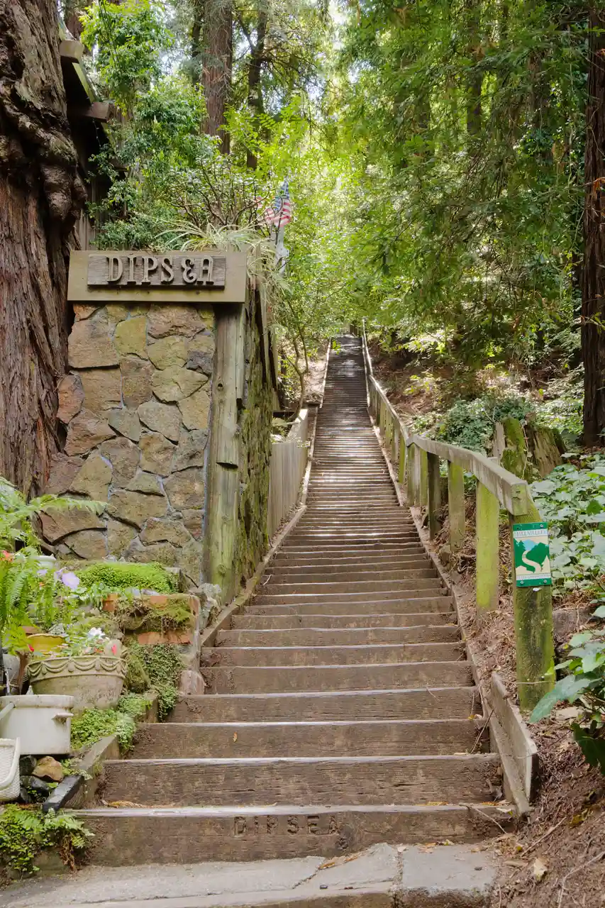 The Dipsea Trail, in Marin County, California, is the route of the annual Dipsea Race. The trail itself is approximately long, Official race site. running from Mill Valley up and over a ridge and down to the Pacific Ocean at Stinson Beach. Runners in the race are not restricted to follow just one pathway; especially towards the endpoint some runners diverge along less traveled paths which they may have practiced and deem advantageous. For the majority of the route, almost all competitors follow one main path which climbs and descends stairways and is otherwise well-defined. Read more on Wikipedia