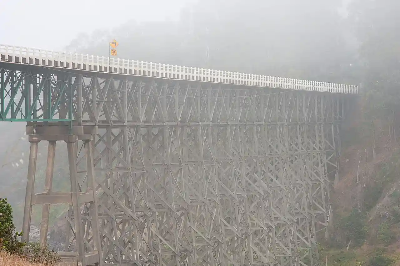 The Albion River Bridge is a wooden deck truss bridge crossing the Albion River in Mendocino County, California. It is the only remaining wooden bridge on California State Route 1;. dramatic views of the bridge are visible from the nearby town of Albion, California.. It was listed on the National Register of Historic Places in July 2017. Read more on Wikipedia
