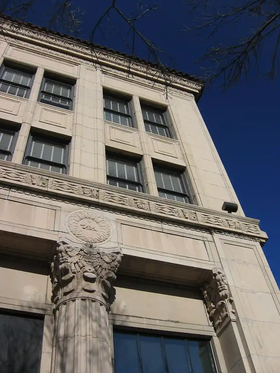 The Bank of Italy is a historic bank building located at the intersection of Main and Canal Streets in Merced, California. Opened in 1928, the bank was Merced's branch of the Bank of Italy. Henry A. Minton designed the building in the Classical Revival style. The bank's design includes a flat, clay tile roof with terra cotta mansards and an ornamental cornice and frieze. Five Corinthian columns are situated on the building's Main Street facade, and seven pilasters face Canal Street. The first and second floors of the bank are separated by a decorative band of panels; the band features alternating square panels displaying an Indian head or an eagle separated by rectangular panels with a diamond design. The building's exterior is mostly faced in Travertine marble; the base is faced in granite, and parts of the first floor were covered with stucco in the 1950s. Read more on Wikipedia