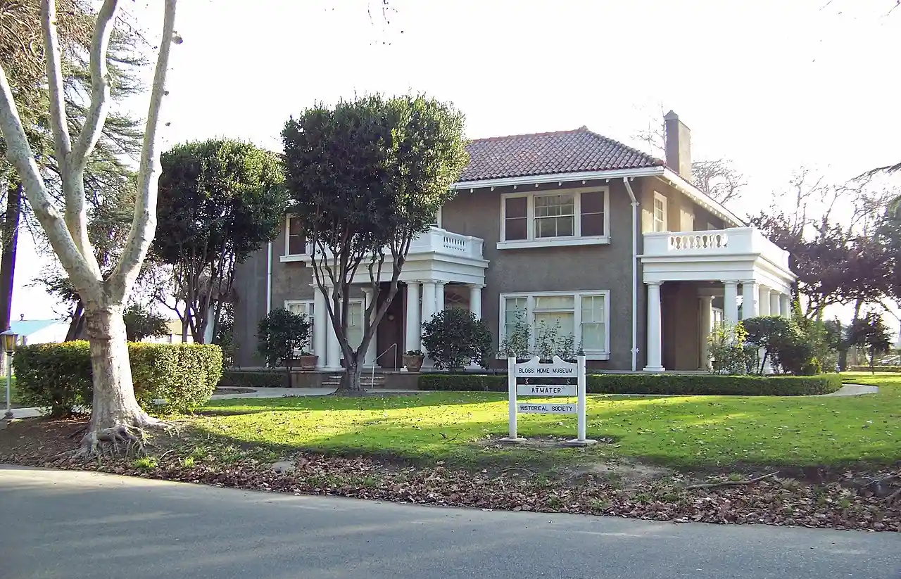 The Bloss Mansion is a historic house located at 1020 Cedar Ave. in Atwater, California. The house was built in 1914 by George Bloss, the first mayor of Atwater and a prominent donor to the city. The house's design reflects several popular architectural styles of its era. The Mission Revival Style had the greatest influence on the structure, as exhibited in its stucco construction and tile roof. Prairie School elements of the house include its three-part windows, broad eaves, and overall emphasis, while the house's front entrance and side porch have a Classical design with Tuscan columns. Read more on Wikipedia