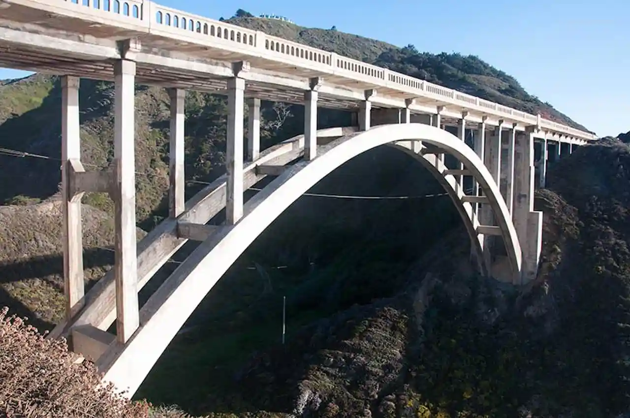 Rocky Creek Bridge is a reinforced concrete open-spandrel arch bridge on the Big Sur coast of California, built in 1927, its official name is Ben Jones, referred to as Rocky Creek Bridge features a reinforced-concrete, open-spandrel, fixed, parabolic-arch, a decorative cantilevered walkway, and reinforced-concrete railings in an arched-window design. It is located in Monterey County, on the State Route 1 (Cabrillo Highway) about south of the city of Carmel, and about a mile north of the more famous Bixby Creek Bridge. Rocky Creek Bridge is one of seven similar bridges along State Route 1 known as the Big Sur Arches, it is individually eligible for the National Register of Historic Places under Criterion A for providing important crossings for the Carmel-San Simeon Highway, originally State Route 56 (now State Route 1), and under Criterion C as an outstanding example of modern concrete arch construction with heavily inflected piers, and thin arch rings and spandrels As its name implies, it spans Rocky Creek. A turnout with limited parking space exists to the northwest of the bridge, for tourist use. Read more on Wikipedia