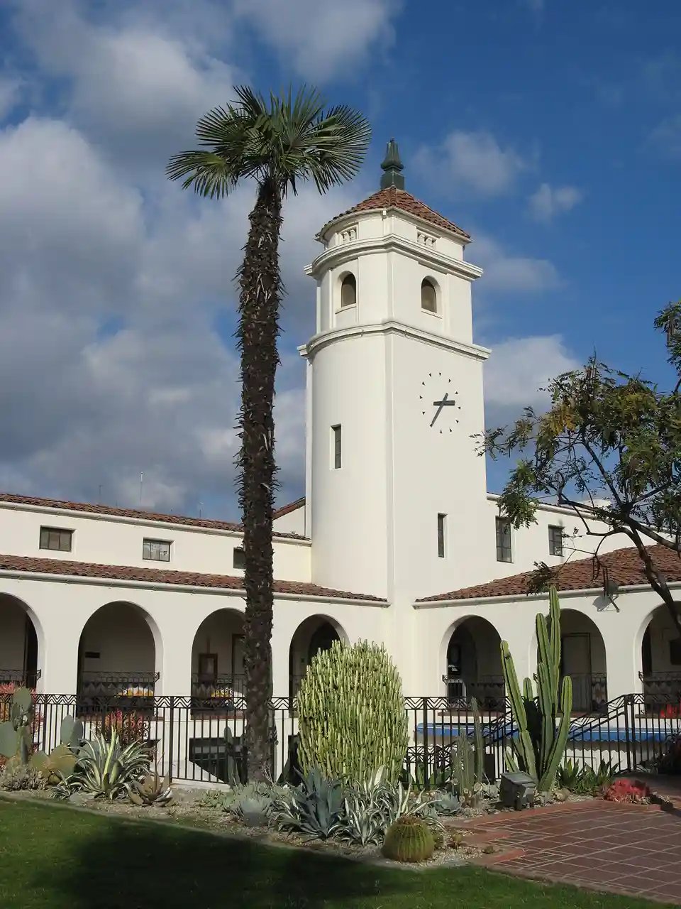 The historic Fullerton City Hall, at 237 W. Commonwealth Ave. in Fullerton, California, was built during 1939 to 1942. It was designed in Mission Revival style by influential architect G. Stanley Wilson, and was made of poured concrete. Ceramic tiles and terra cotta for the project were produced by Gladding, McBean and Company. Read more on Wikipedia