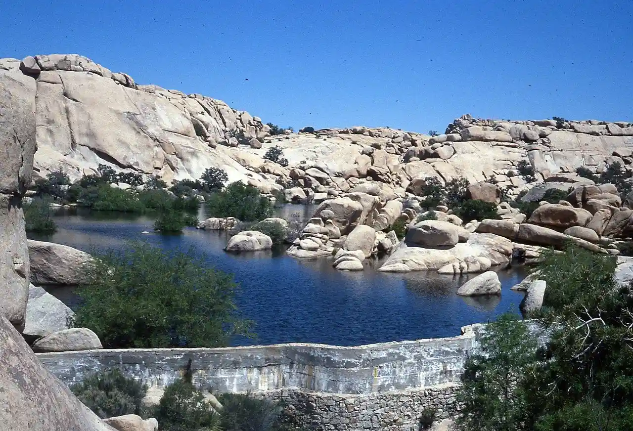 Barker Dam, also known as the Big Horn Dam, is a dam with water-storage reservoir located in Joshua Tree National Park in California. The dam was constructed by early cattlemen, including C. O. Barker, in 1900. It was raised in 1949 by rancher William F. Keys. It is situated between Queen Valley and the Wonderland of Rocks near the Wall Street Mill. It is a gathering place for desert wildlife, including many species of birds and desert bighorn sheep. Visitors can reach the dam via a short loop trail from a nearby parking lot off Barker Dam Road, and can see Native American petroglyphs a short distance to the west. There is also good bouldering on side trails near the dam. The park offers a Barker Dam Nature Hike led by a ranger. Read more on Wikipedia