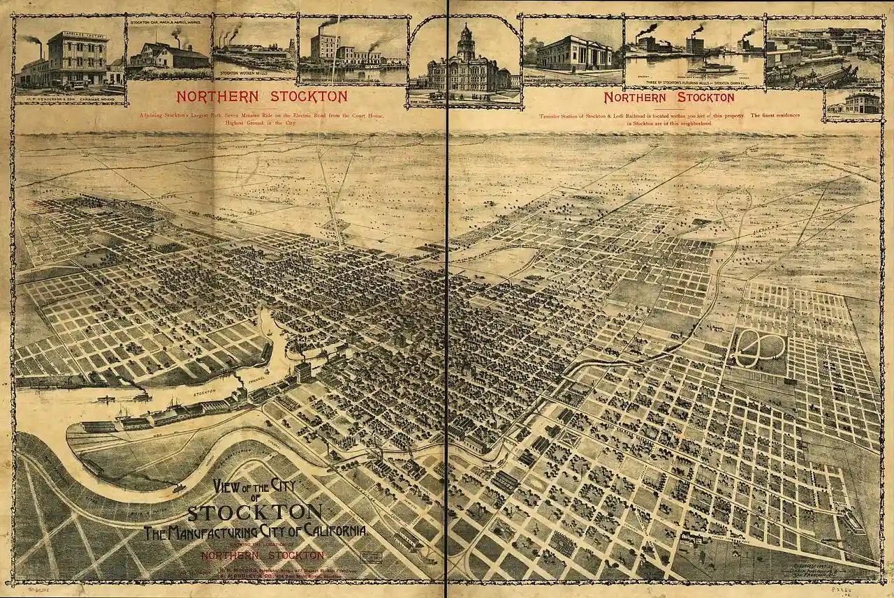 Lindsay Point was the First Building in Stockton the site is a historical place in Stockton, California in San Joaquin County. Lindsay Point site is a California Historical Landmark No. 178, listed on March 6, 1935. The first settlers arrived at Rancho Campo de los Franceses in August 1844. One of the early settlers was Thomas Lindsay. Lindsay copied the natives and built a tule reed hut. Lindsay was later killed by natives and buried by other settlers. The Lindsay Point is the meeting site of McLeod Lake (Stockton Channel) and the Miner's Channel. Miner's Channel ran between Miner Street and Channel Street. Miner Street sometimes flood, so it was piped and filled in. In 2000 archaeologists did an excavation of the past site of Miner Channel and uncovered artifacts from 1890s to the 1930s. The excavation was done before the new Cineplex complex was built. Read more on Wikipedia
