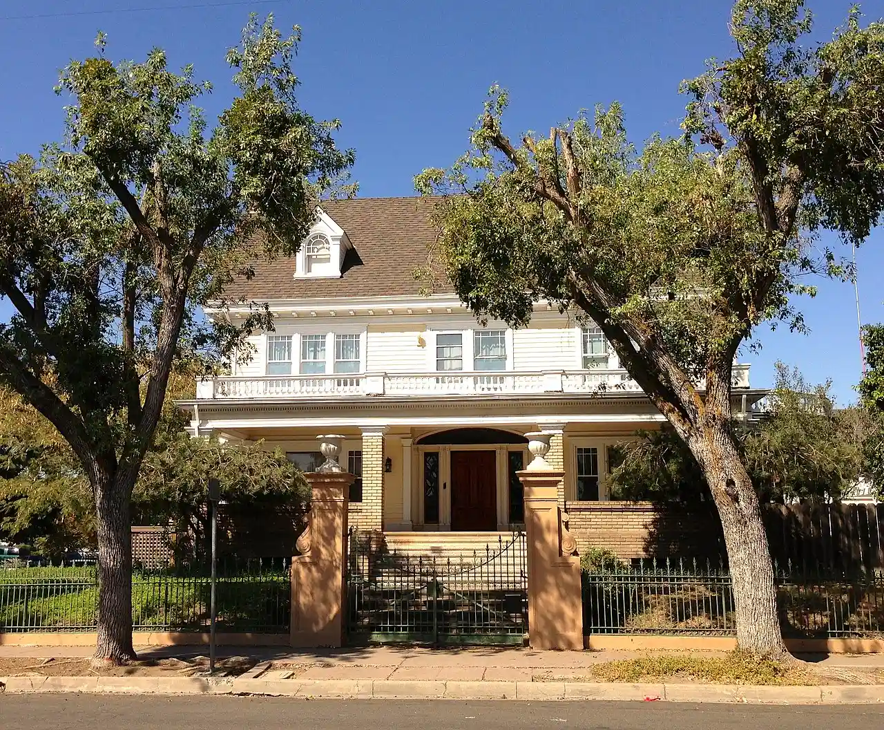 The Wong K. Gew Mansion is a historic house located at 345 W. Clay St. in Stockton. The mansion was the home of Wong K. Gew, a Chinese immigrant and a successful gambler and proprietor of gaming houses. When Wong built his home in 1921, anti-Asian laws required that he build his home south of Main Street. The mansion was designed by Losekann and Clowdsley in a mainly Federal Revival style typical of large houses of the era. The design included a veranda and a second-floor balcony on the front of the house, boxed cornices with brackets and friezes on the eaves and walls, and three gabled dormers; the interior of the house includes a fireplace with a $2,200 Yum Nan marble mantle. Read more on Wikipedia