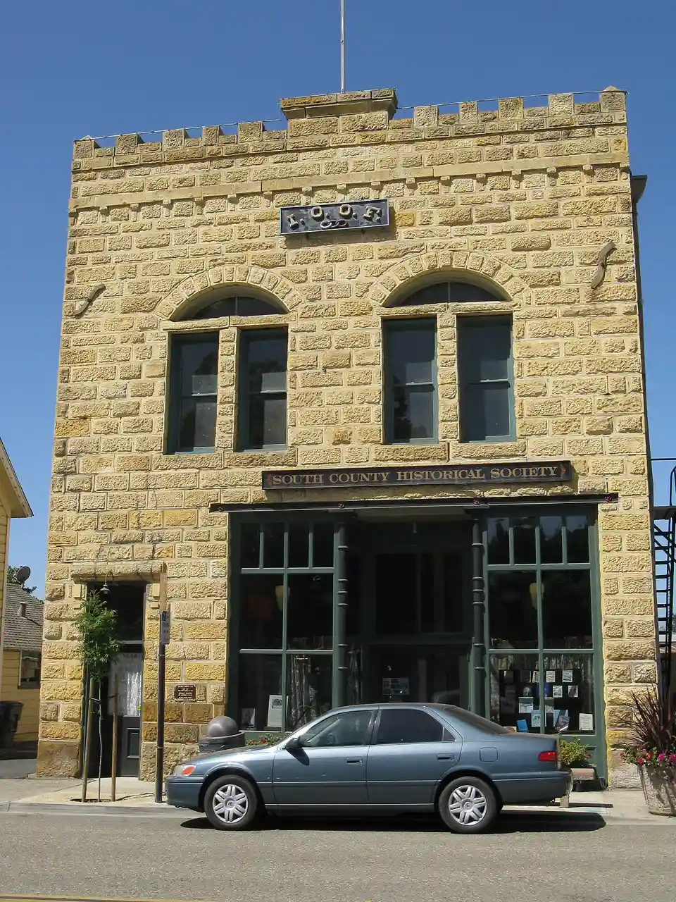 The Arroyo Grande IOOF Hall is a building in Arroyo Grande, California, that was built in 1902. The building housed the town's chapter of the Independent Order of Odd Fellows, which was established in 1887. The order planned a two-story building with a storefront on the first floor; the building is one of the tallest in downtown Arroyo Grande. The sandstone building was designed in the Romanesque style and features segmentally arched windows and doors and a crenellated parapet with a large merlon in the center. In 1985, the Odd Fellows lodge disbanded, and the building is now owned by the South County Historical Society. It was listed on the National Register of Historic Places in 1991. Read more on Wikipedia