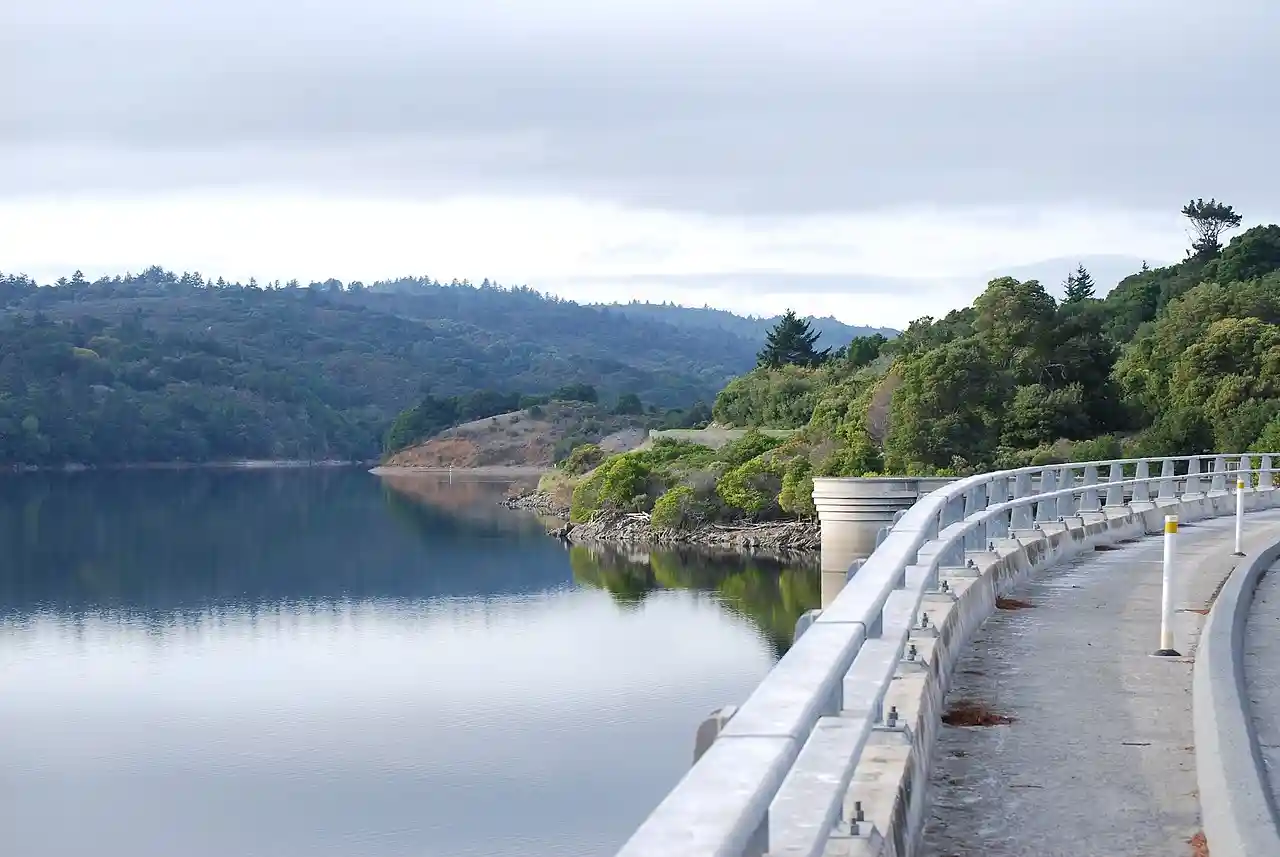 Crystal Springs Dam is a gravity dam constructed across the San Mateo Creek which is in San Mateo County, California. It impounds water to form the Lower Crystal Springs Reservoir which sits atop the San Andreas Fault in a rift valley created by the fault. The dam itself is located about 300 yards (273 meters) east of the fault.San Andreas Bay Area FaultsSan Mateo Ezrim It was among the first concrete gravity dams built in the western United States.Advanced Dam Engineering for Design, Construction, and Rehabilitation, by Robert B. Jansen, page 117 Skyline Boulevard runs over the dam, which also forms the trailhead of the popular Sawyer Camp Trail. Read more on Wikipedia