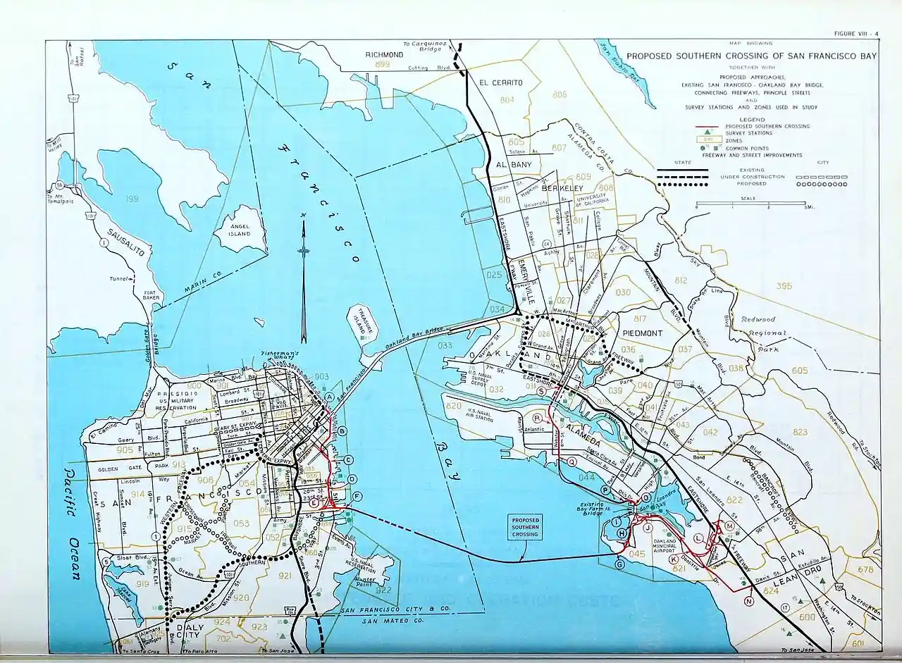 The Southern Crossing is a proposed highway structure that would span San Francisco Bay in California, somewhere south of the San Francisco–Oakland Bay Bridge and north of the San Mateo–Hayward Bridge. Several proposals have been made since 1947, varying in design and specific location, but none of them have ever been implemented because of cost, environmental and other concerns. Read more on Wikipedia