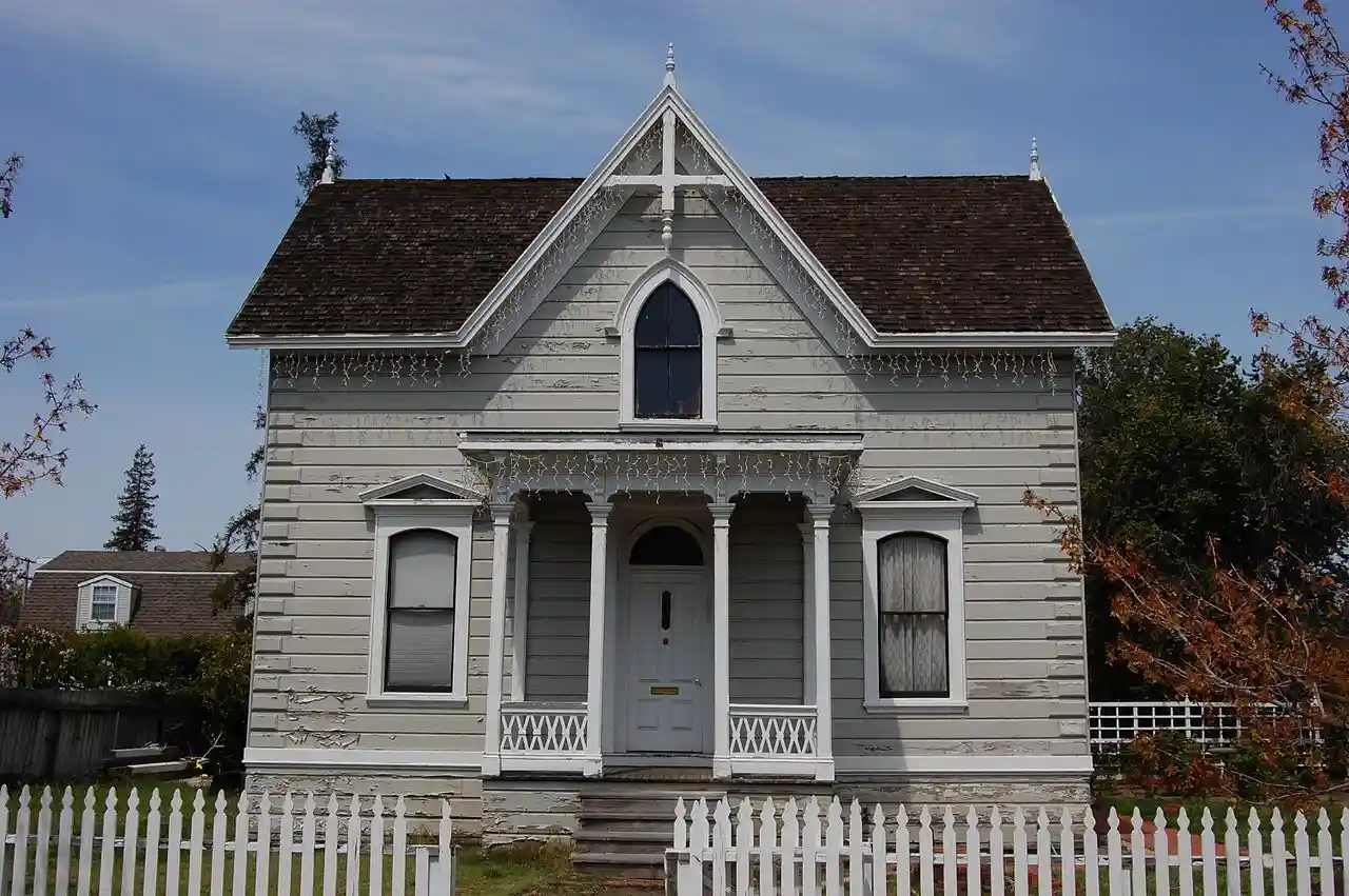 The Andrew J. Landrum House in Santa Clara, California, was built by Andrew J. Landrum, a prominent Santa Clara pioneer. Constructed in 1875, the house is an example of eclecticism in architectural styles. Landrum combined the then-popular Italianate and Carpenter Gothic styles he found in pattern books, as seen in the corner quoins, the Italianate porch with scroll brackets, gables with cross-bracing and the cruciform interior plan. The two-story wooden residence was built on a T-shaped plan which exhibits crossed, steeply gabled rooflines which are punctuated by a brick chimney and sheathed in wooden shingles. Read more on Wikipedia