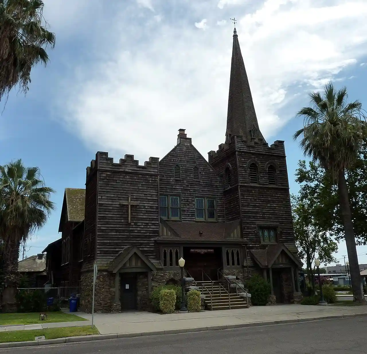 First Congregational Church is a historic church building at 165 E. Mill Street in Porterville, California. The church was built in 1908 by Porterville's Congregationalists. San Francisco architects Francis W. Reed and George C. Meeker designed the church; their design applies the principles of the First Bay Tradition to a Gothic Revival plan. The design includes a shingled wooden exterior, typical of the First Bay Tradition, and a Gothic spire and arches; the church is the only building in the southern San Joaquin Valley to incorporate both styles. The new church building served as an "institutional church" which also provided community services, including an auditorium, a gymnasium and swimming pool, and a private kindergarten. . Read more on Wikipedia