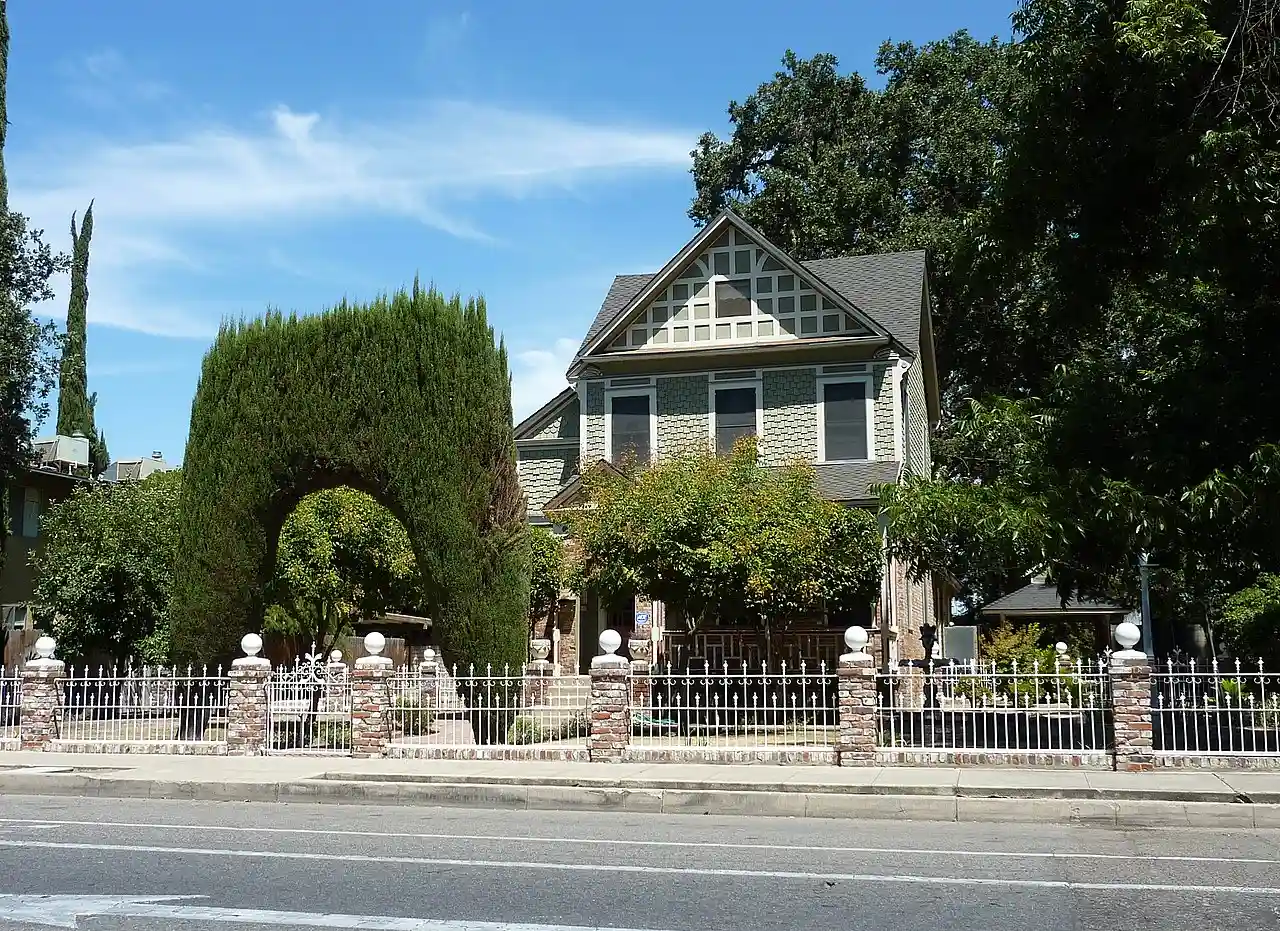 The Hyde House is a historic house located at 500 S. Court St. in Visalia, California. E. O. Miller, an investor and politician, built the house in 1886; it was purchased by investor Richard E. Hyde and his family soon afterwards. The house was mainly designed in the Queen Anne style. Its design features a half-timbered front gable end, scaled and irregular shingles, and a porch with a Chinese Chippendale railing. Read more on Wikipedia