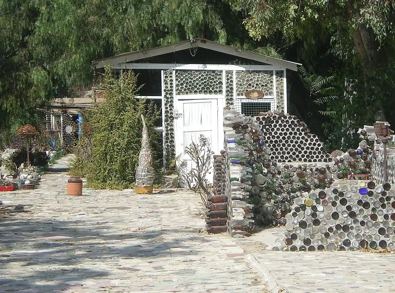 Grandma Prisbrey's Bottle Village, also known as Bottle Village, is an art environment, located in Simi Valley, California. It was created by Tressa "Grandma" Prisbrey (1896–1988) from the 1950s to the 1970s. Prisbey built a "village" of shrines, walkways, sculptures, and buildings from recycled items and discards from the local landfill. Read more on Wikipedia