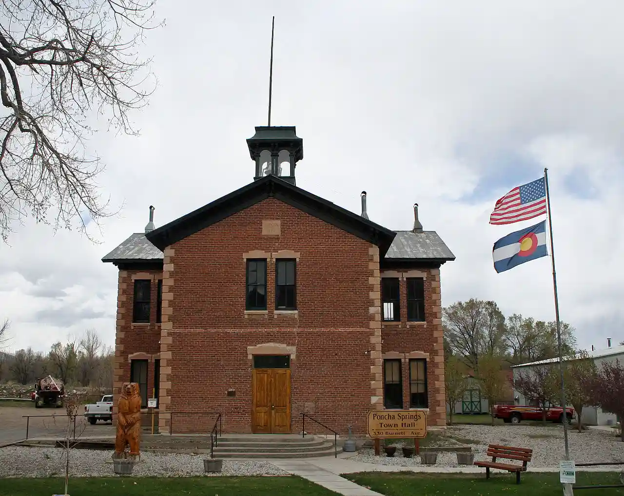 The Poncha Springs Schoolhouse, at 330 Burnett St. near Poncha Springs, Colorado in Chaffee County, Colorado, was built in Italianate style during 1881–83. It was listed on the National Register of Historic Places in 1990. It was then the Poncha Springs Town Hall and Museum. Read more on Wikipedia