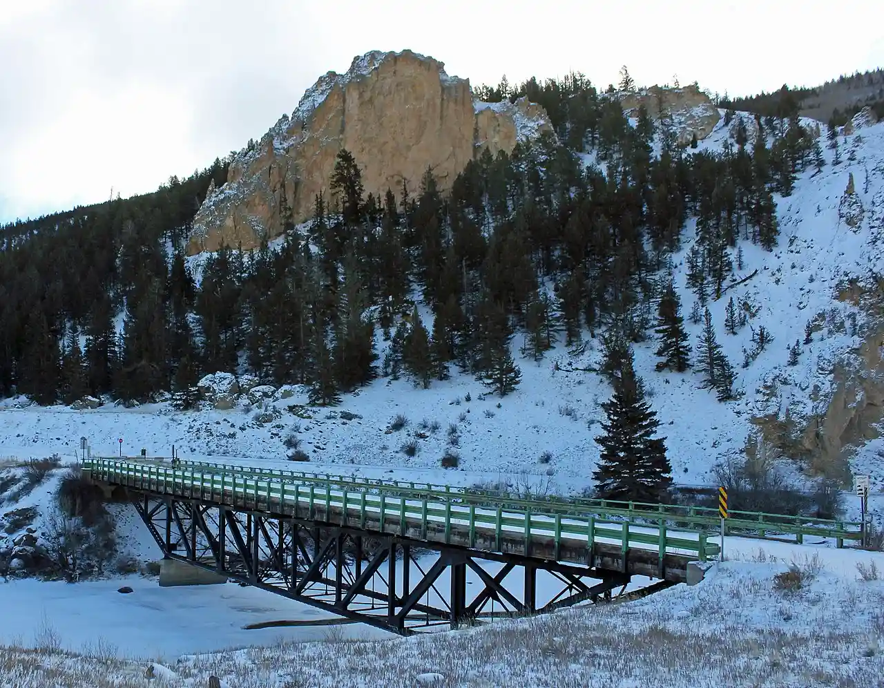 The Sevenmile Bridge is a Pratt deck truss bridge bringing a county road over the Rio Grande, southwest of Creede, Colorado, United States. It was designed by engineer King Burghardt and is unusual for its cantilevered ends. It was built in 1935; it then carried State Highway 149. It has also been known as Bridge over Rio Grande River. It was listed on the National Register of Historic Places in 1985. Read more on Wikipedia