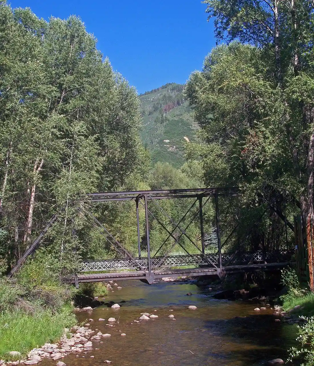 The Sheely Bridge, originally known as the Carbondale Bridge, carries pedestrian traffic across the Roaring Fork River at Mill Street Park in Aspen, Colorado, United States. It is a short steel truss bridge originally located downstream in Carbondale and later moved to its present location. Read more on Wikipedia