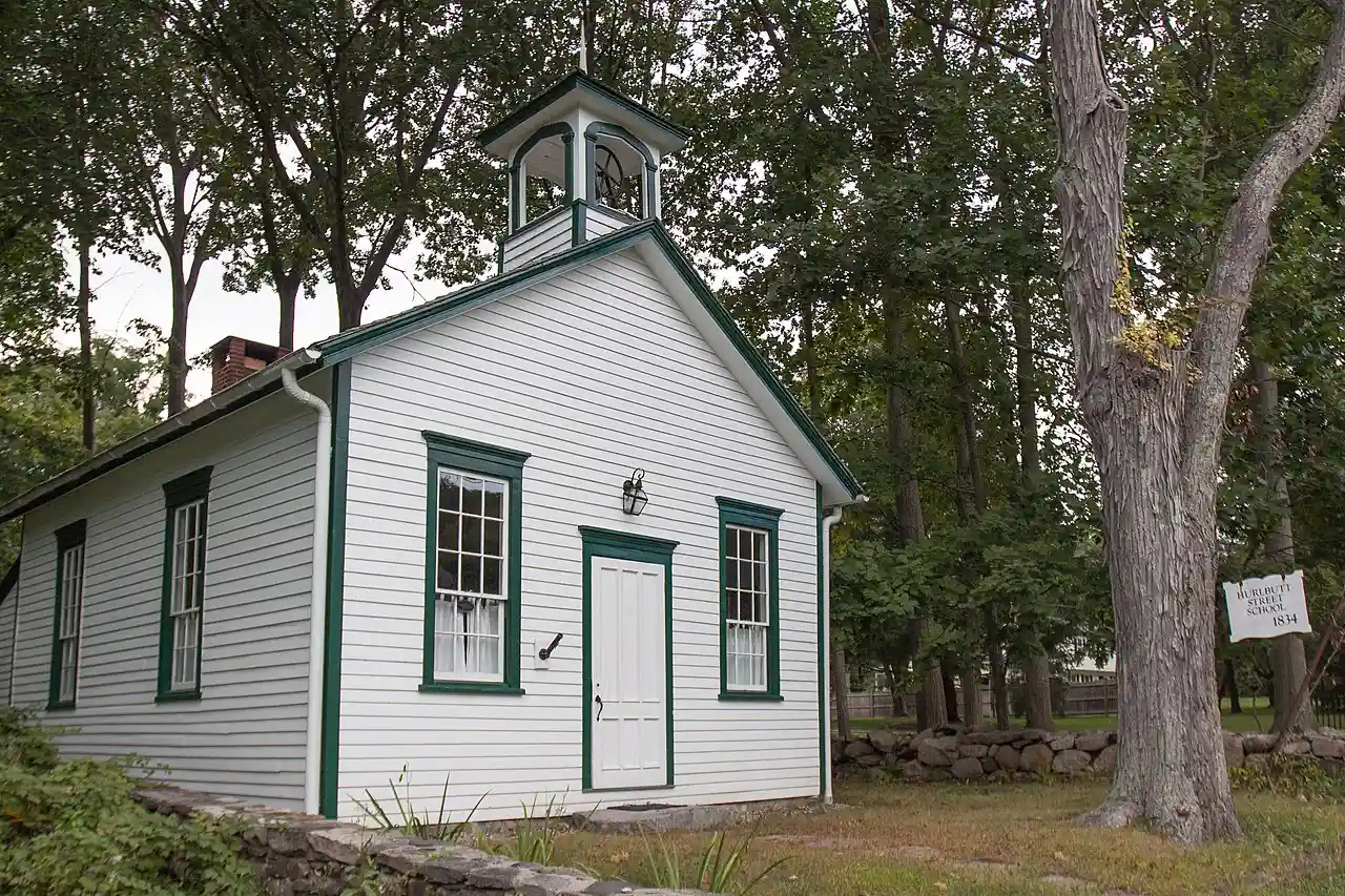 The Hurlbutt Street School is a historic one-room schoolhouse at 157 Hurlbutt Street in Wilton, Connecticut. Built in 1834, it served the town as a school for nearly a century, and was then converted into a local history museum. It is the town's best-preserved 19th-century district school building, and was listed on the National Register of Historic Places in 1996. Read more on Wikipedia