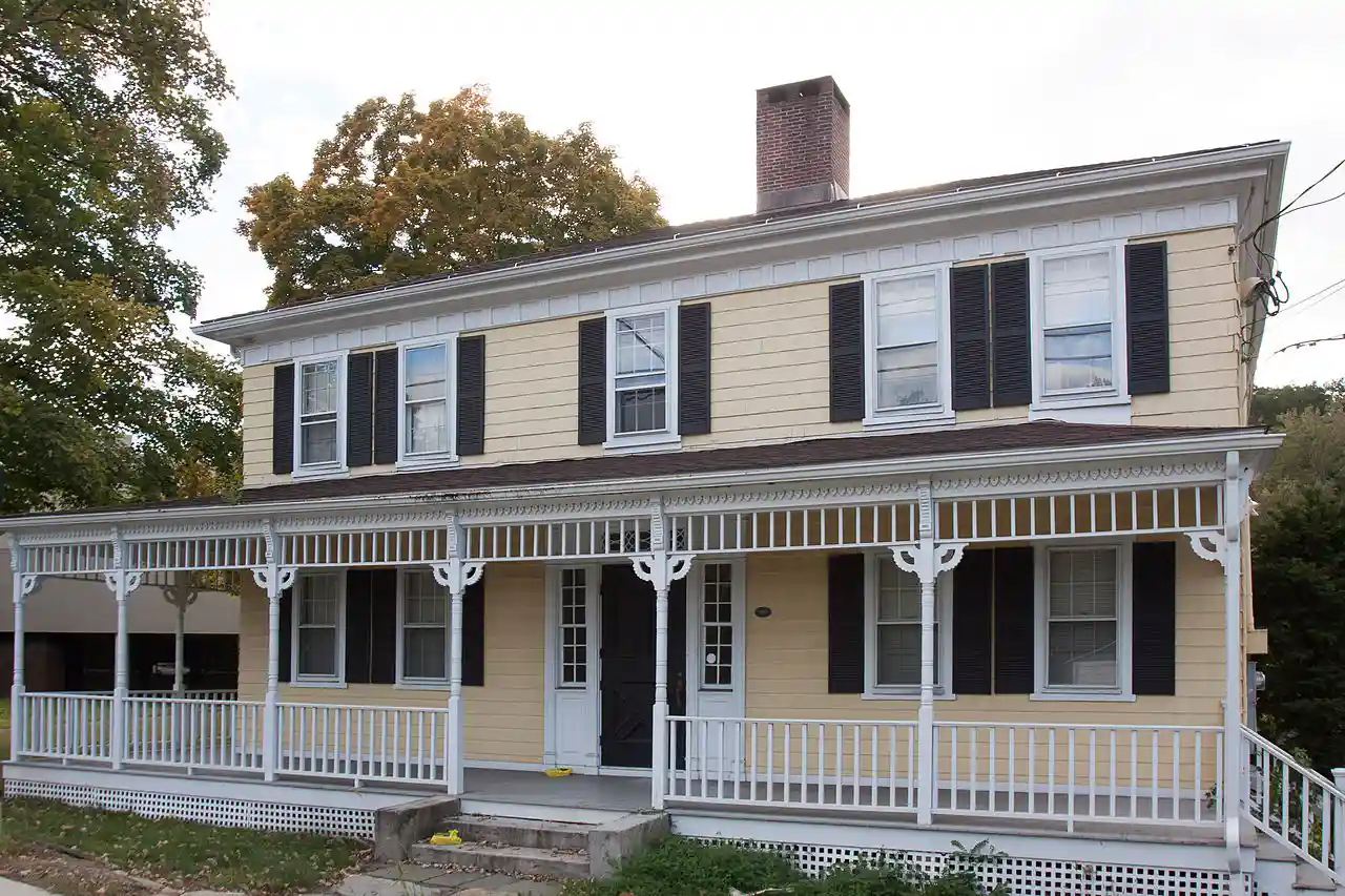 The Marvin Tavern, also known as Matthew Marvin House, is a historic house located at 405 Danbury Road in Wilton, Connecticut, Located adjacent to Wilton High School. It is a -story wood-frame structure, with a hip roof and a large central chimney. Although it was built c. 1760, its most prominent feature is its porch, added c. 1880, which features turned posts, a spindled frieze, and decorative jigsawn brackets. It is also of interest to architectural historians for a number of features, including its flared eaves, which were rare in the region before the 19th century. and Read more on Wikipedia