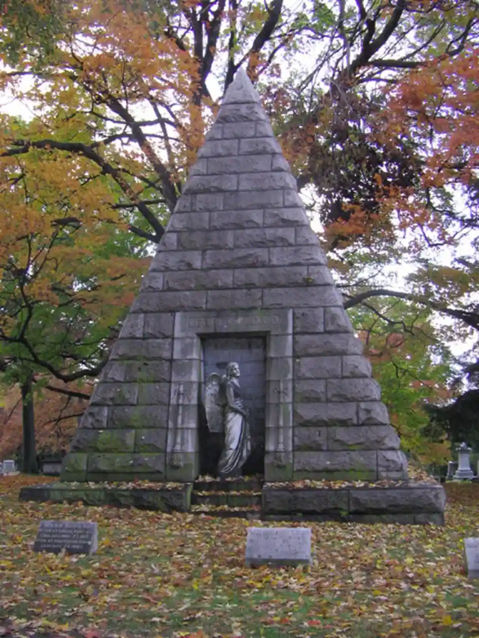 Cedar Hill Cemetery in Hartford, Connecticut is located at 453 Fairfield Avenue. It was designed by landscape architect Jacob Weidenmann (1829–1893) who also designed Hartford's Bushnell Park. Its first sections were completed in 1866 and the first burial took place on July 17, 1866. Cedar Hill was designed as an American rural cemetery in the tradition of Mount Auburn Cemetery in Cambridge, Massachusetts. Read more on Wikipedia