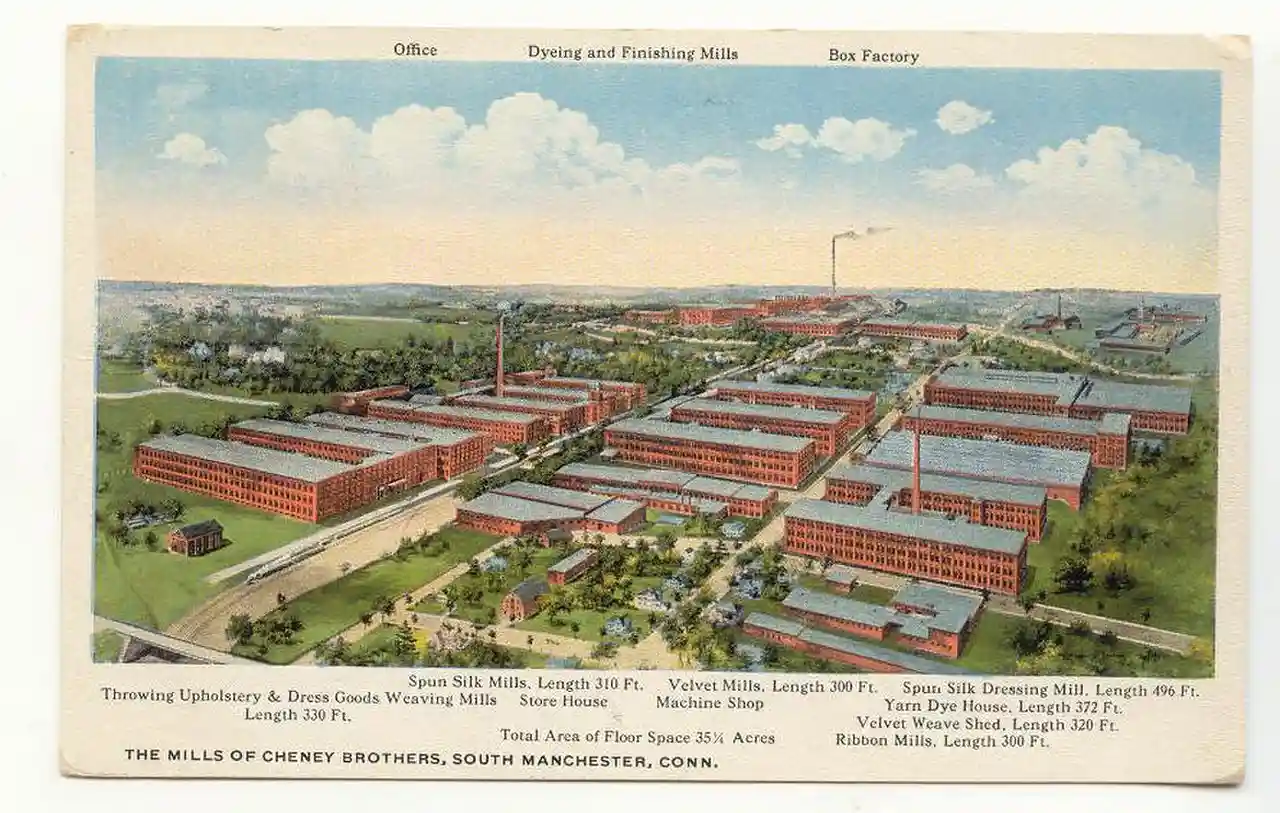 The Cheney Brothers Historic District was a center of the silk industry in Manchester, Connecticut, in the late 19th and early 20th century. The district includes over 275 mill buildings, workers houses, churches, schools and Cheney family mansions. These structures represent the well-preserved company town of the Cheney Brothers silk manufacturing company, the first America-based silk company to properly raise and process silkworms, and to develop the difficult techniques of spinning and weaving silk. Cheney Brother Historic Landmark District, Manchester Historical Society The area was declared a National Historic Landmark in 1978. Read more on Wikipedia
