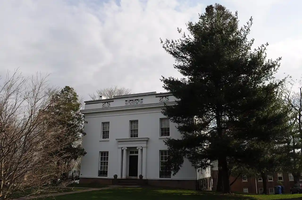 The Edward Augustus Russell House is a Greek Revival house on the Wesleyan University campus in Middletown, Connecticut, USA. The house, at 318 High Street, faces west from the east side of High Street north of the corner at High and Court Streets. A large wooded lawn extends to the Honors College (Russell House 1828) property to the north. High Street between Church and Washington Streets was the most prestigious residential area in Middletown during the 19th century. It was later home to the KNK Fraternity of Wesleyan University. The structural system consists of load-bearing masonry with a flat roof, and materials include brick and flushboarding walls and a brownstone foundation. Read more on Wikipedia