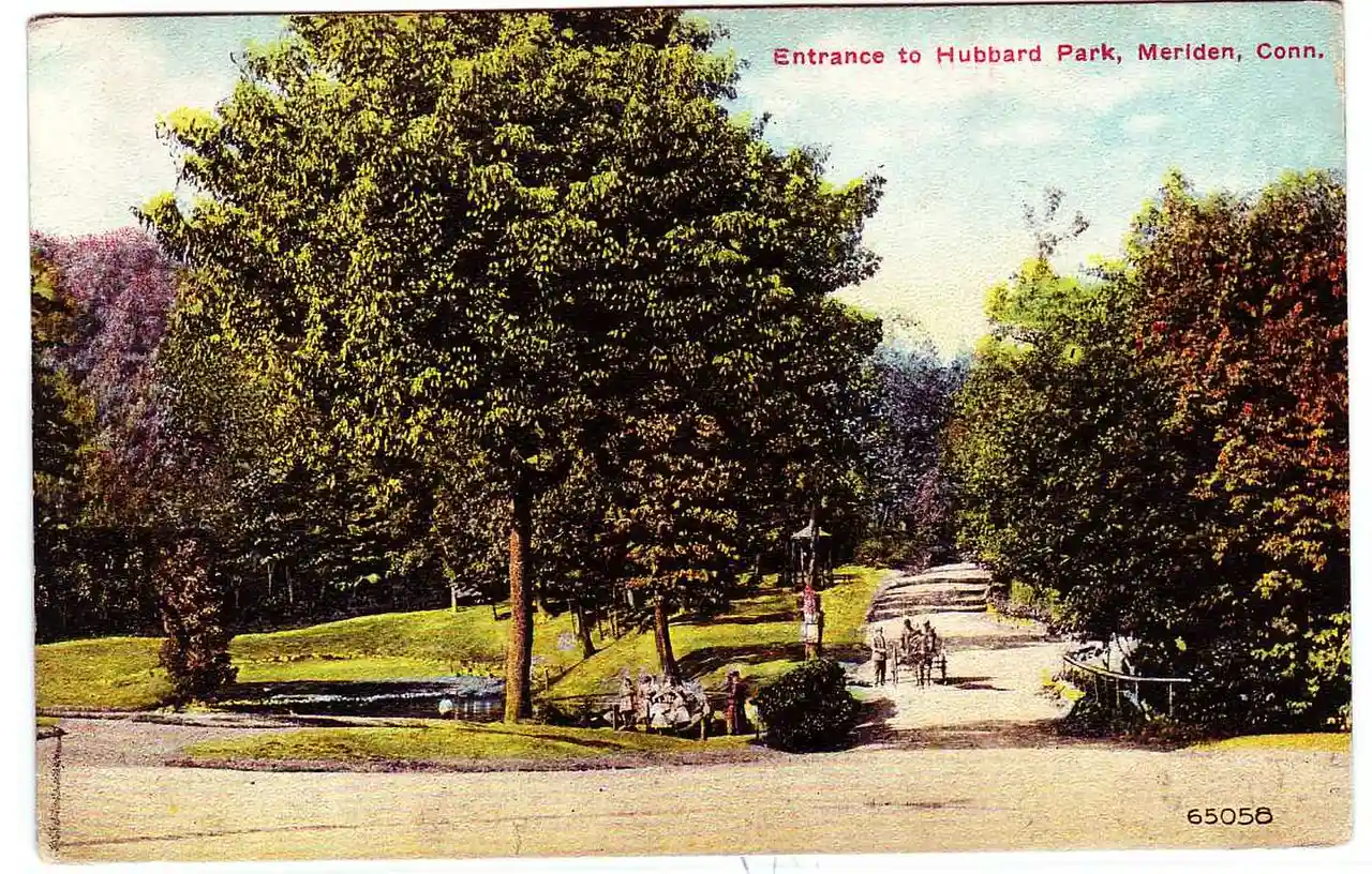 Hubbard Park, located in the Hanging Hills of Connecticut, is a wooded, mountainous park located just outside the city center of Meriden, Connecticut. It comprises approximately of carefully kept woodlands, streams, dramatic cliff faces, flower gardens, and the James Barry bandshell and picnic spots, as well as its showpiece, Mirror Lake. The park is listed on the National Register of Historic Places. Read more on Wikipedia