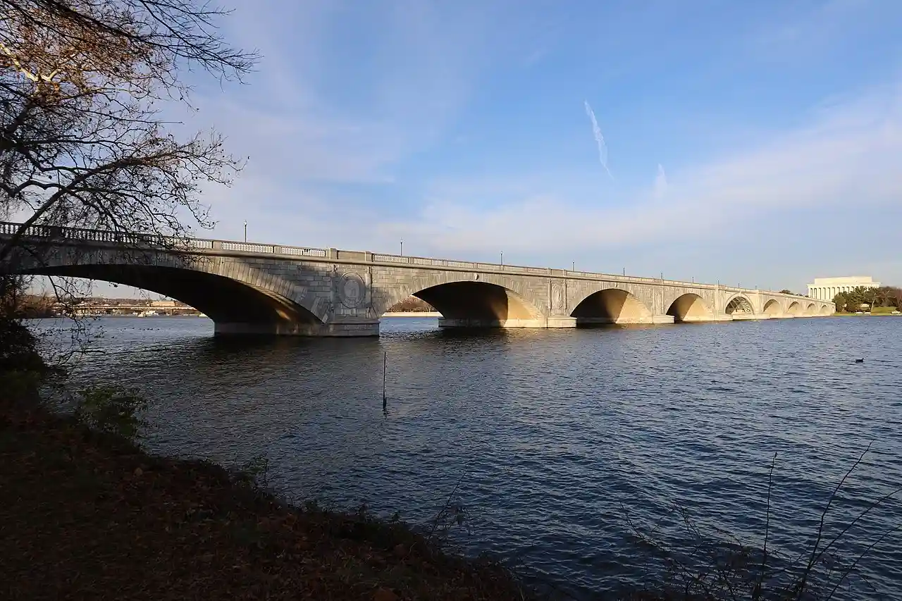 The Arlington Memorial Bridge, often shortened to Memorial Bridge, is a Neoclassical masonry, steel, and stone arch bridge with a central bascule (or drawbridge) that crosses the Potomac River in Washington, D.C., the capital of the United States. First proposed in 1886, the bridge went unbuilt for decades thanks to political quarrels over whether the bridge should be a memorial, and to whom or what. Traffic problems associated with the dedication of the Tomb of the Unknown Soldier in November 1921 and the desire to build a bridge in time for the bicentennial of the birth of George Washington led to its construction in 1932. Read more on Wikipedia