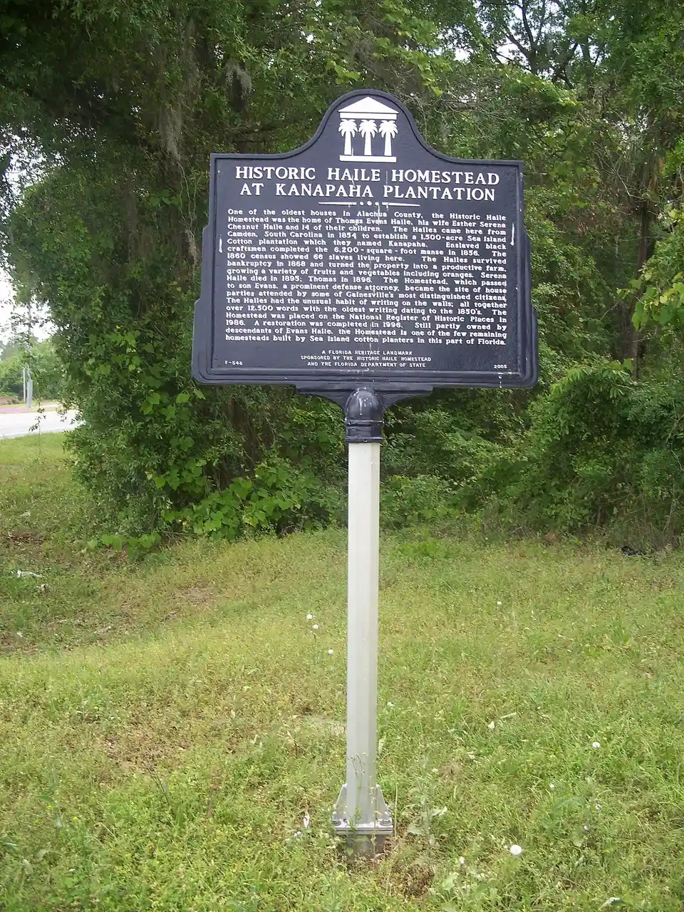 The Historic Haile Homestead, also known as Haile Plantation House or Kanapaha, is a historic site and museum in Gainesville, Florida, United States. It is located at 8500 SW Archer Rd. SR 24. On May 2, 1986, the plantation house was added to the U.S. National Register of Historic Places.The Homestead is unique in the Nation for its "Talking Walls." For a reason lost to time the Haile family and friends wrote over 12,500 words on the walls, dating back to the 1850s. Read more on Wikipedia