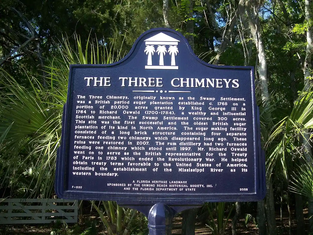 Three Chimneys Archaeological Site is located at 715 West Granada Boulevard in Ormond Beach, Florida. The three chimneys within the site were part of a sugar-processing plant owned by Richard Oswald, a wealthy Scottish merchant, who owned a nearby plantation throughout the British rule of Florida. That plantation is now on the grounds of Tomoka State Park. It was listed on the National Register of Historic Places on September 16, 2010. Read more on Wikipedia
