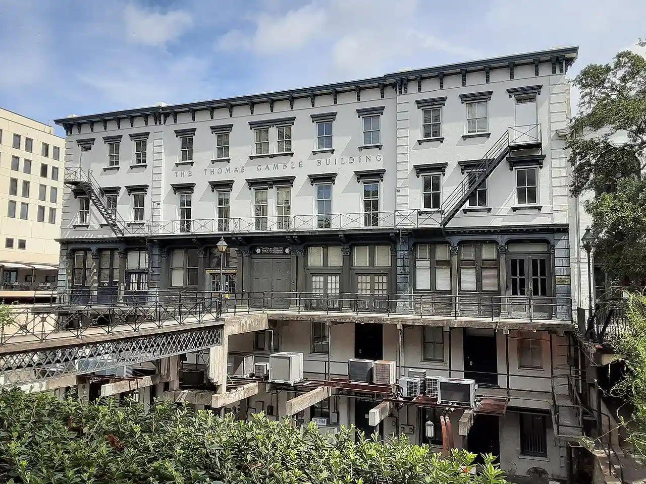 The Thomas Gamble Building, formerly known as the Eugene Kelly Stores, Kelly's Block and Kelly's Building,"Savannah Archives: Millionaire Eugene Kelly financed 1877 construction of Gamble Building" – Savannah Morning News, December 26, 2021 is a historic building in Savannah, Georgia, United States. Located in Savannah's Historic District, between Upper Stoddard Range to the east, Savannah City Hall to the south and the Hyatt Regency Savannah to the west, the addresses of some of the properties are East Bay Street, above Factors Walk, while Olympia Cafe occupies the former King Cotton warehouses on the River Street elevation. Read more on Wikipedia