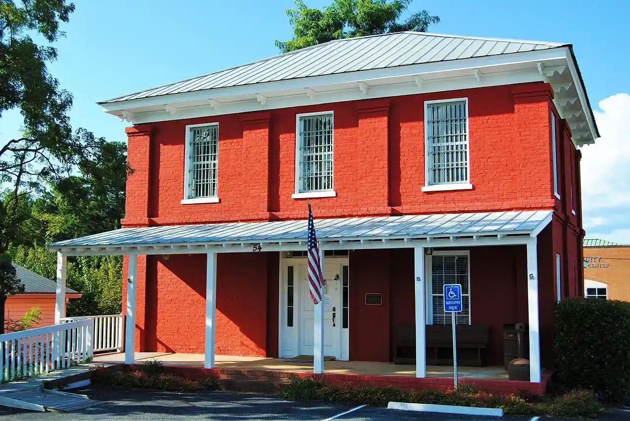 The Dawson County Jail in Dawsonville, Georgia, also known as Old Dawson County Jail, is listed on the National Register of Historic Places. It was built in 1881 and modified in 1931, 1974, and 1979. It was built by M.B. McGinty, a builder from Athens, Georgia. Read more on Wikipedia