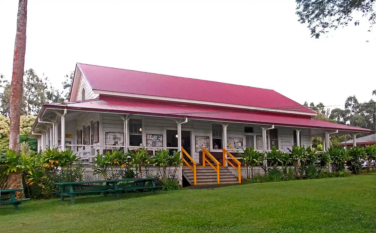 The Kohala District Courthouse is a historic courthouse in Kapaau on the island of Hawaii. The courthouse was built in 1889 to serve as a district court for the Kingdom of Hawaii; it continued to serve as a courthouse through U.S. annexation and Hawaii's eventual statehood, only closing in 1975. It was designed in the style of a traditional Hawaiian plantation house, which is reflected in its wide lanai, single-walled exterior, and corrugated metal roof; the ornamentation on its lanai sets it apart from other local buildings. A statue of Kamehameha I, who was born in Kohala, stands in front of the building. . Read more on Wikipedia