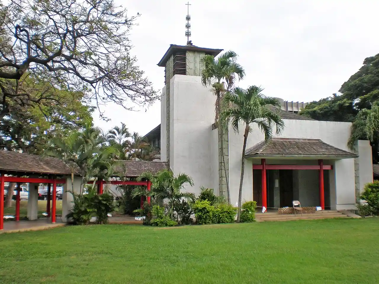 The Church of the Crossroads building at 1212 University Avenue in Honolulu, Hawaii was designed in 1935 by Claude A. Stiehl, who combined features of Asian, European, and Hawaiian architecture. It was listed on the National Register of Historic Places in 1992. The buildings on the attractively landscaped lot are built of wood, stucco, and stone with decorative elements. The interior courtyard is surrounded by covered walkways that connect the main sanctuary with offices, meeting halls, and a small seminar room. The red columns throughout the complex were inspired by the Summer Palace and Temple of Heaven in Beijing, China.Sandler, Mehta, and Haines 2008, p. 65 At the raised front end of the classic, cross-shaped nave are an altar of Philippine mahogany and four wood carvings with symbols of Buddhism, Hinduism, Judaism, and Zoroastrianism.Hemphill 1988, p. 32 Read more on Wikipedia