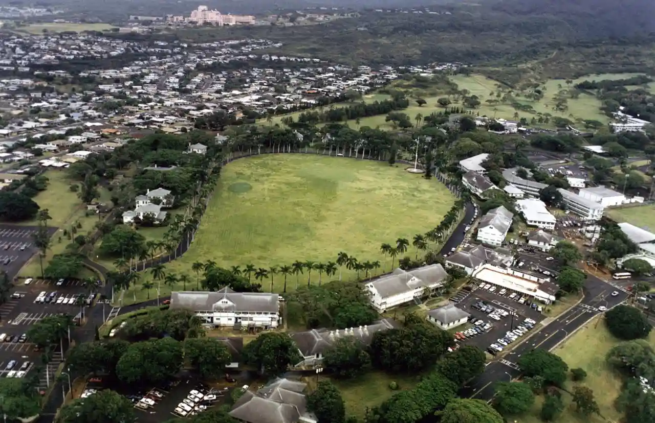 Palm Circle or the Pineapple Pentagon, is a historic portion of Fort Shafter in Honolulu, Hawaii. Designated a National Historic Landmark in 1987, it housed the headquarters of the commanding general and his staff, U.S. Army forces, Pacific Ocean Areas, during World War II. By 1944 this command was responsible for the supply and administration of all U.S. Army personnel in the Central and South Pacific, and from 1943 to 1945, carried out logistical planning for the invasions of the Gilberts, Marshalls, Marianas, Guam, Palau, and Okinawa. Read more on Wikipedia