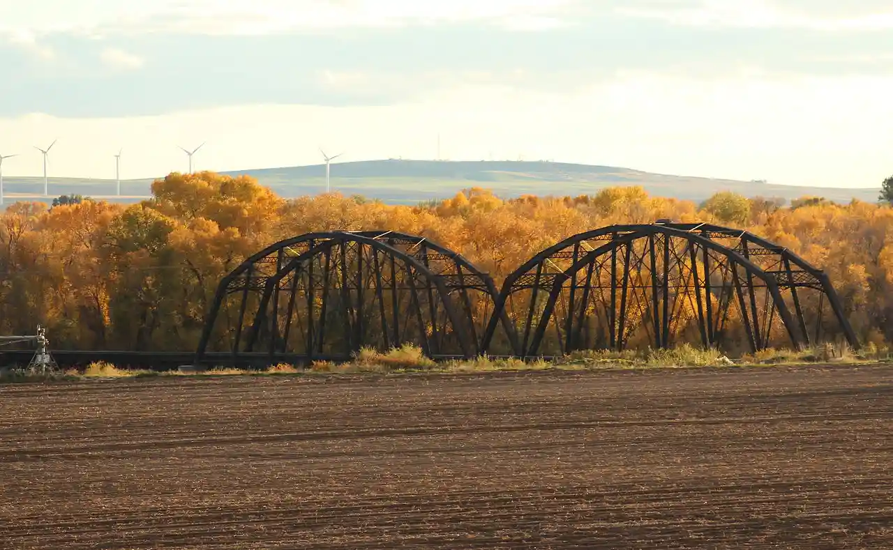 The Ririe A Pegram Truss Railroad Bridge is a Pegram truss railroad bridge which crosses the Snake River north of Ririe, Idaho. The bridge, which carries a one-track section of the East Belt Branch, consists of two truss spans and is long by wide. The bridge was originally constructed for a crossing in Nyssa, Oregon in 1894 for the Union Pacific Railroad and was relocated to its current site in 1914, where it carried Oregon Short Line Railroad tracks. The bridge's Pegram truss design was the work of George H. Pegram, the chief engineer for Union Pacific; as Pegram held a patent on the design, all surviving Pegram truss bridges were commissioned during Pegram's tenure with the Union Pacific and Missouri Pacific railroads. Read more on Wikipedia